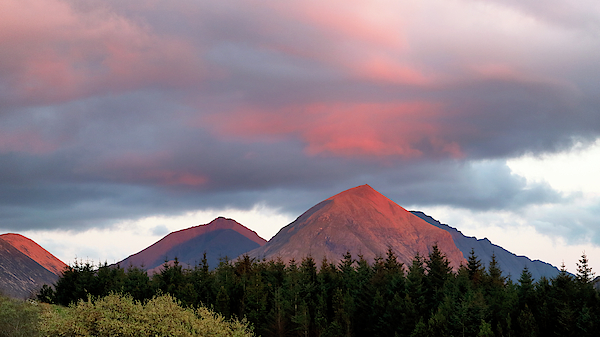 The Cuillins (An Cuilthionn) are a range of rocky mountains that dominate the central region of the Isle of Skye. Normally dark and forbidding, the peaks glow deep red when kissed by final light of the setting sun.
