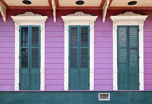Historic timber house brightly painted in lavender and blue.
