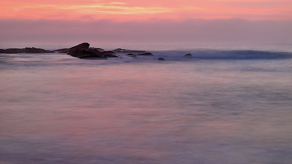 The colours of sunrise captured in a long exposure image of the waves on the seashore.